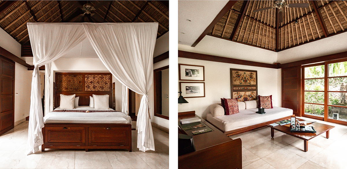 We stayed at one of the 22 deluxe pool villas (the resort has another 4 pool villas and 38 cottage suites) which had very large rooms, all decorated in a traditional Balinese style. After opening the gate and crossing the beautiful private garden we entered the villa in the spacious living room, which had a large sofa, a separate desk and even a dining table. The bedroom had one of these nice, large and comfortable beds with a romantic tropical mosquito net, yet I liked the bathroom the most: very spacious closet space, a his and her sink, a bathtub and two showers: one indoor and one outdoor shower, which I just love!